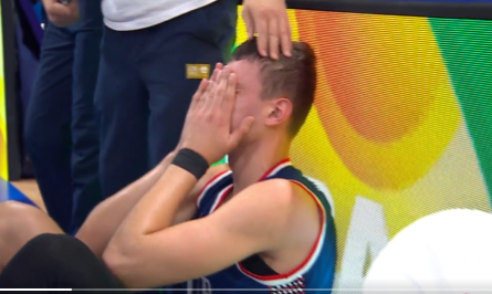 Košarkaši Srbije, pogođeni sudijskom nepravdom zbog koje su ostali bez zlata, odmah posle meča sa Nemačkom, posedali su na parket i – zaplakali.