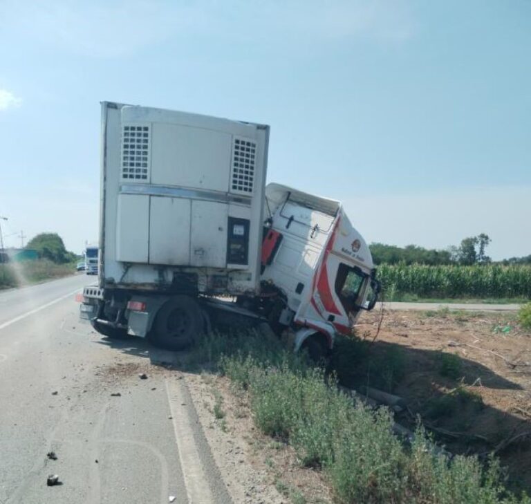 Kamion natovaren bocama metana koji je učestvovao u nezgodi, sleteo je u kanal pored puta. Policija je na licu mesta i vrši uviđaj, kao i vatrogasci-spasioci koji penom za hlađenje polivaju boce.